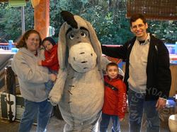 Next, we found a spot where Pooh, Tigger and Eeyore were posing for photos. JSL was happy to finally see them and we got our pictures taken. Then we had some ice cream cones for a quick snack/lunch. After that, we saw more characters. This time Thumper and Miss Bunny (2010 autograph #’s 7 & 8), Chip and Dale (2010 autograph #’s 8 & 9), Donald, Minnie, Mickey and Goofy.