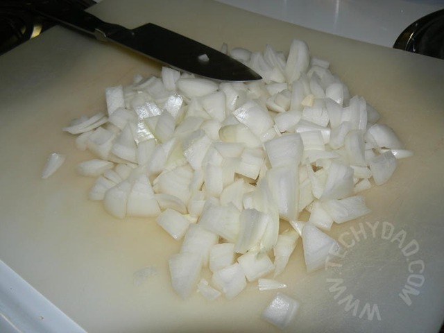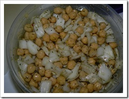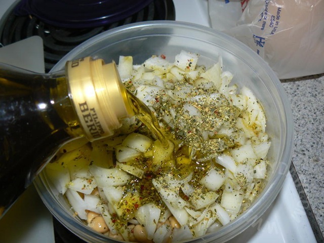 That would be chickpeas (2 cans), a small onion, the Greek rub and some olive oil. Now, we we chop up the onion.