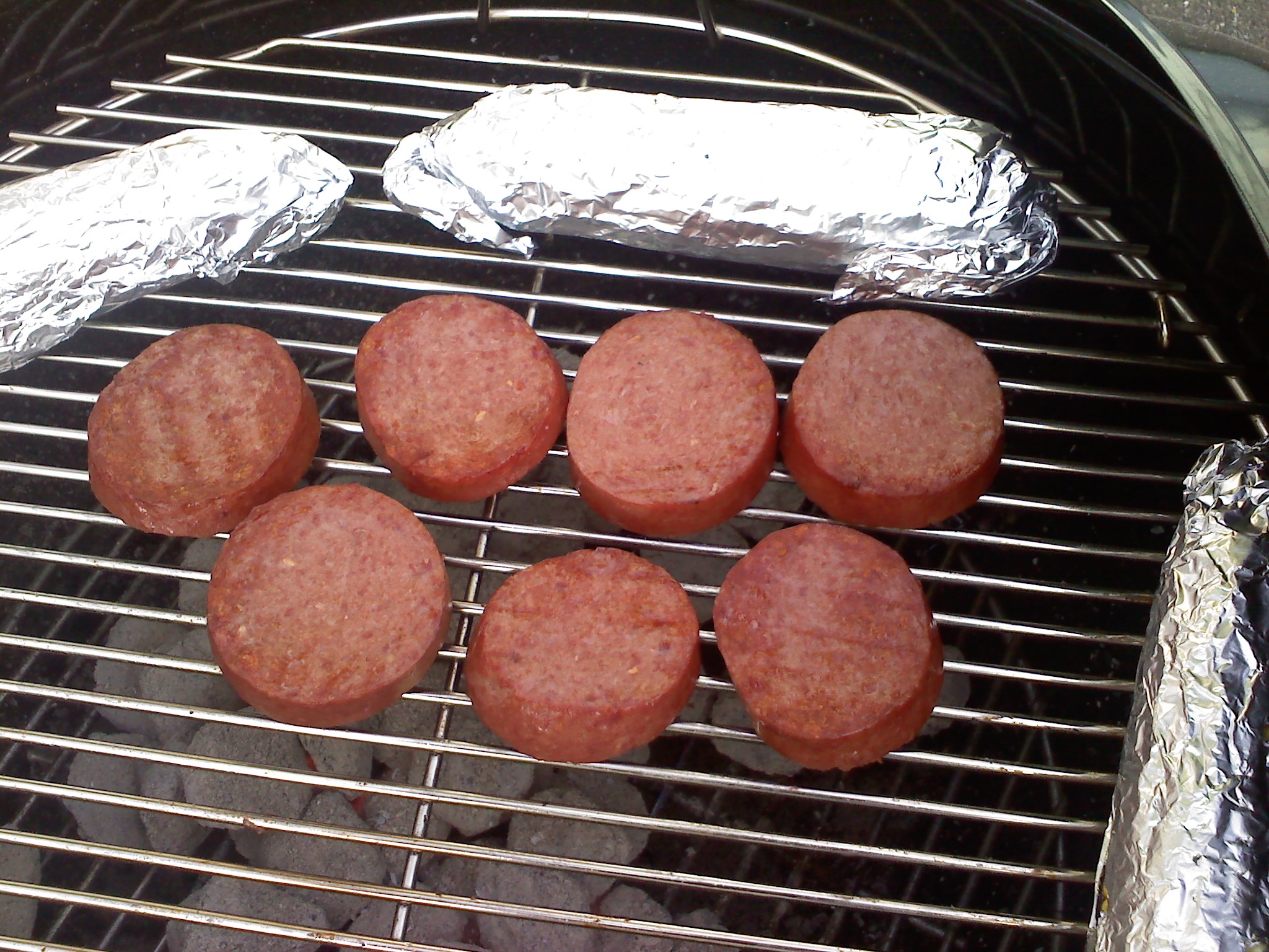 This is what I’m grilling right now. Corn on the cob & salami. Soon to be added: Zucchini, hot dogs & pineapple.