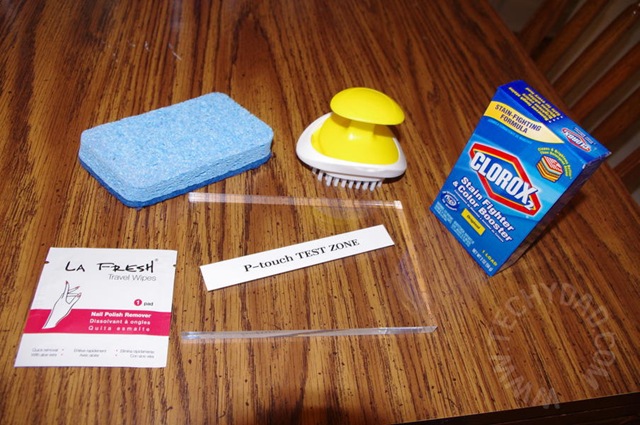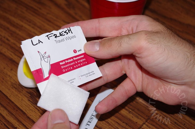 Inside was a sponge, scrub brush, abrasive soap, a wipe soaked in nail polish remover and a piece of plexiglass with a label attached.