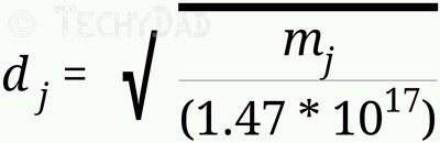 On the other hand, we could keep Jupiter the same size and just move it closer to the Earth. Solving for distance, we get this equation:
